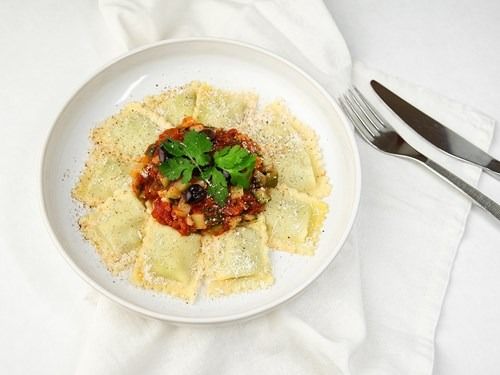 Käse-Kräuter-Ravioli auf Tomaten-Zucchini-Würfel und Taggiasca Oliven