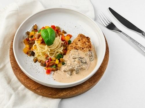 Gebratene Hähnchenbrust mit Morchel Sauce‚ Tagliatelle und Ratatouille