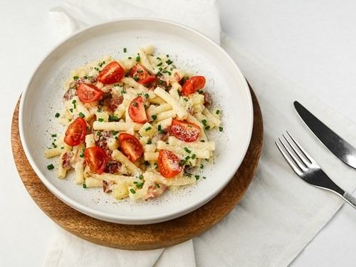 Traditionelles Schweizer Nudelgericht mit Kalbsspeck‚ Gruyère Käse‚ Kartoffeln und Apfelspalten