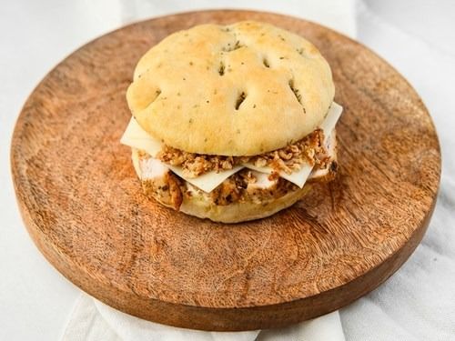 Rosmarin Focaccia mit gegrillter Hähnchenbrust‚ Gruyère-Käse‚ Mayonnaise und Röstzwiebeln
