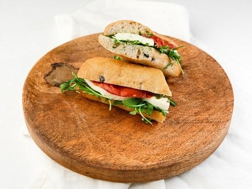 Oliven-Brot mit Mozzarella‚ getrockneten Tomaten‚ Rucola und Pesto