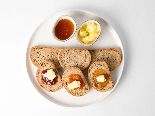 Heissgetränk‚ Brot‚ Butter und 2x Konfitüre‚ Honig und Haselnusscrème
