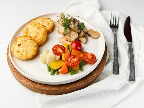 Zartes Hähnchenfleisch mit Röstitalern und gemischtem Gemüse